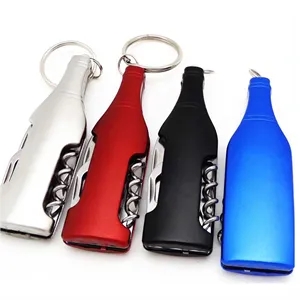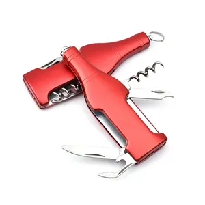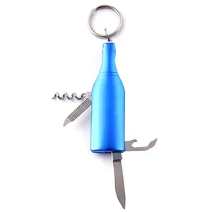 Multi function 4 tools kit, combines knife, corkscrew, wine bottle opener, nail polisher and keyholder in one. Metal construction, solid aluminum outer case with plenty of room for your logo or message.