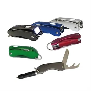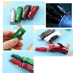 Our multi Functional LED Foldable Ball Pen is made of plastic and metal,tool includes: foldable ball pen,LED light, Pocketknife,Bottle/can opener. Suitable for camping,hiking,traveling,repairing, outdoor activity,emergency, etc.